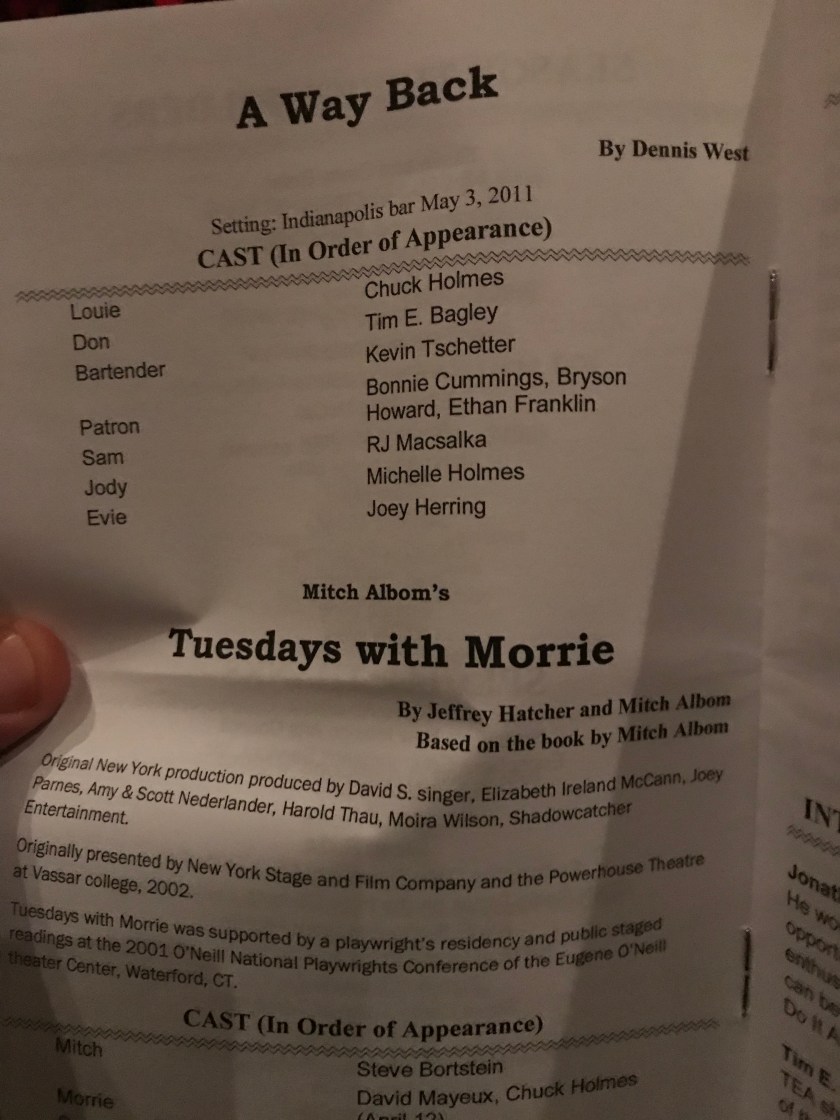 Actually, there are two plays tonight: “Tuesdays with Morrie” and “A Way Back” by local playwright Dennis West.
