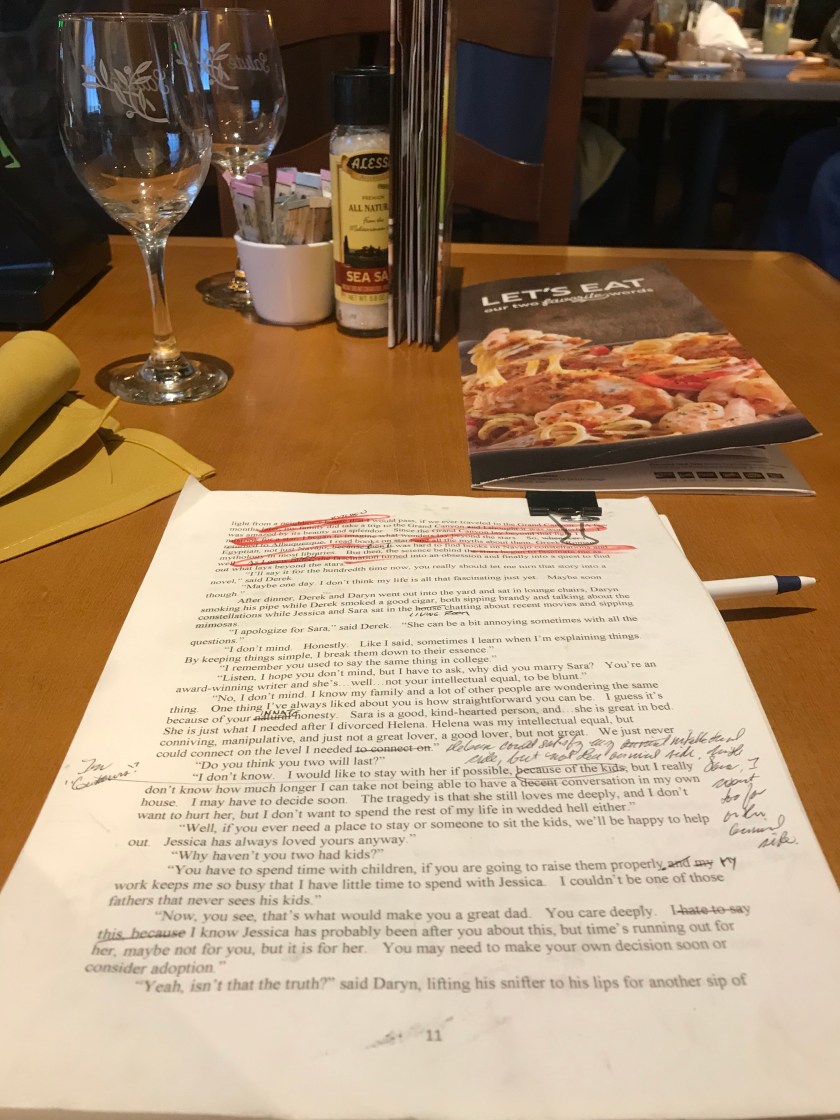 I couldn’t come up with an idea at Angel Peak, so I changed locations. I had a taste for the minestrone at Olive Garden, so here I am. I went over the very short chapters before and after where I wanted to insert the new chapter, and decided that they worked better as one chapter and that I didn’t need the new chapter. Now on to another chapter.